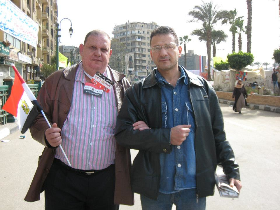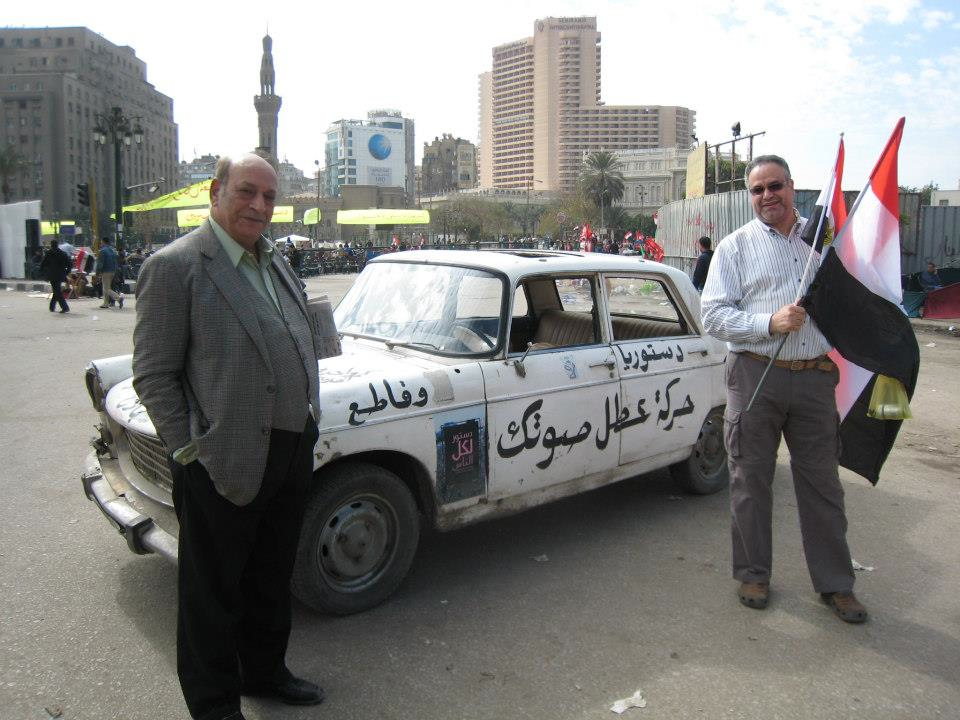 Other photos: [top, right] A Christian Coptic jeweler and a Muslim engineer walking arm in arm, in solidarity. [bottom, left] “Broken car doesn’t go anywhere, like our broken government,” says (L) a retired Cairo magazine editor and Nader, who works with independent unions and the AFL-CIO-supported Soldarity Center. [bottom, right] A protester holds a tear gas canister, made in USA.
