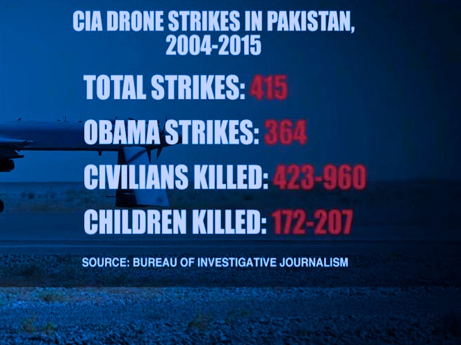 In Yemen, according to The Bureau of Investigative Journalism’s report, drone spy technology was used to launch a cruise missile attack in December 2009 against Al Qaeda that killed 44 civilians, including 22 children. That missile attack was launched from a U.S. Navy ship unleashing 166 exploding cluster sub-munitions with over 200 sharp steel fragments. In Pakistan, “targeted killings” by American drones over the past decade have caused as many as 4,000 deaths, the Bureau further reports. Some 423 to 965 of these deaths involve innocent civilians, including 172 to 207 children. The majority of these killings occurred under sponsorship of the Obama administration.